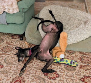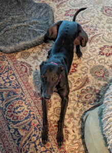 Ian is a wonderful greyhound! He is affectionate and playful. He is also very energetic and needs an active home to keep him occupied. He loves long walks and playing with toys and in the yard. He is not kitty safe but is good with medium and large dogs.